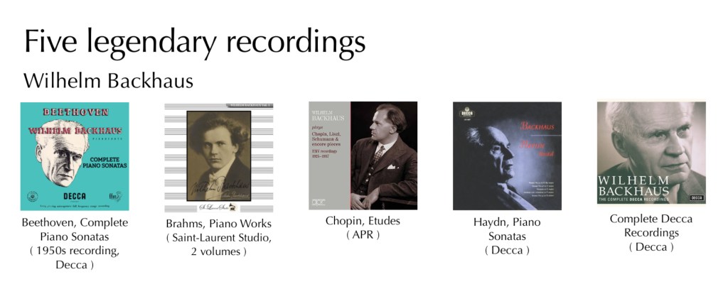 Wilhelm Backhaus was a complete and extremely modern pianist with a much broader repertoire than the public often reduces him to today. He was perhaps the only one to reconcile all the monumentality of the great repertoire with the finest precision and a certain delicacy, which can be heard particularly in the contrasts that structured his concerts – and I can only recommend that you listen to every concert you can find by him. On the other hand, if you want to listen to the complete Beethoven sonatas, I think the Backhaus discs from the 1950s – the mono version is better than the stereo – are an excellent choice, for me the best along with Claudio Arrau and Yves Nat in the regularity and consistency of all these different works.