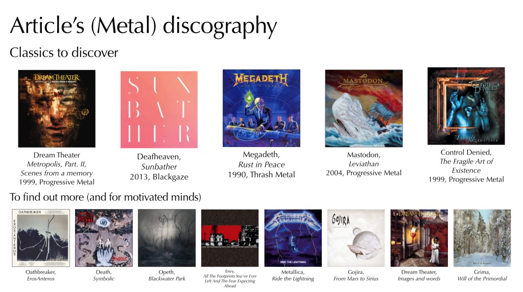 In a way, this is quite analogous to the album culture in metal. A great metal album only makes sense in the order of its tracks, sometimes with purely instrumental interludes, or more electronic transitions. Albums like Metropolis Part.2, Scenes for a memory by Dream Theater, or Deafheaven’s Sunbather – to mention two rather easy-to-access albums – are good examples of this conception of the album as a separate work that needs to be understood in its entirety. And, of course, we shouldn’t forget what heavy metal owes to classical music. Quite a lot, in fact. Metal is a complex, polyphonic and, above all, predominantly – and, above all, originally – acoustic form of music. It’s not uncommon to find instrumental-only tracks on metal albums, and generally speaking, the voices of instruments count for more in this music than the human voice – which often tends, moreover, to move away from clarity and its properly human character, particularly in extreme metal. Many metal bands don’t hesitate to compose complex, polyphonic and – sometimes very – long pieces, in the form of variations on a theme, for example. Progressive metal bands use complex structures, and the instrumental parts are remarkably complex – this can be listened, for example, in Dream Theater, Mastodon and Opeth, or in a rougher style in Meshuggah, Death (then Control Denied) and Enslaved. Metal is also a music that possesses a certain culture of technicality, in the guitar – with Megadeth, and Marty Friedman’s remarkable soli in Rust in Peace -, in the bass – with the extraordinary Steve di Giorgio in the bands Death and Control Denied – or in the drums – with Morbid Angel, and Pete Sandoval (a band name that Hartmut Rosa points out represents a form of perfect representation of metal, between extraordinary formal beauty and dark ambiences, and sometimes (regularly) it must be said, unhealthy. Metal owes an enormous debt to ‘Western art music’, and it’s not uncommon for musicians in the genre to claim their inspiration in classical music – or jazz, and of course rock, and much else besides.